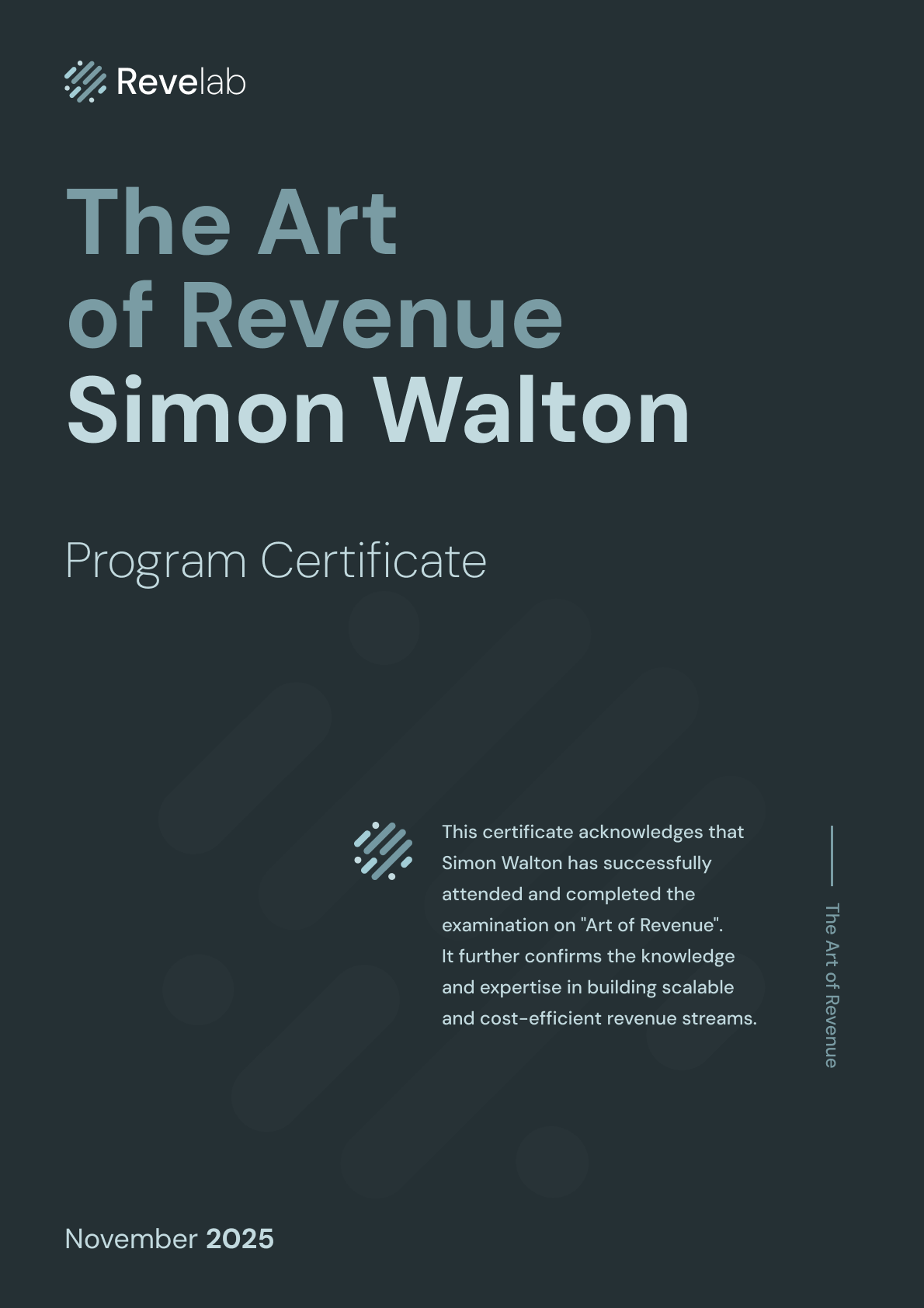 This certificate is more than a document – it is a recognition of your commitment to mastering the principles of revenue growth. It confirms not only the completion of the program but also the acquisition of proven knowledge and expertise in designing, scaling, and optimizing cost-efficient revenue streams.